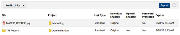The Public Links special report displays all public links, sorted alphabetically by Project/Folder/File name: