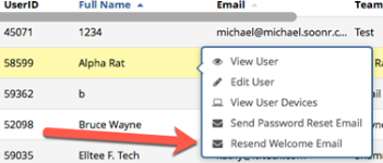 This option appears on the right-click menu for individual users on the Users tab and on the Members list on the Team Detail page. A Resend Welcome Email button is also available on the User Detail page.