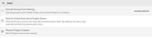 To accommodate the new Exclude Groups from Sharing policy, we've added a Users category to our policies pages. The Restrict Unlock Override to Project Owner has also been moved into this section: