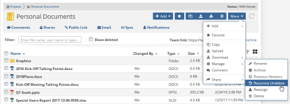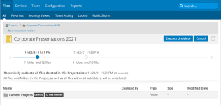If files or folders have been mistakenly deleted in Workplace, you no longer have to undelete them individually. If you are the project owner or a Super Administrator, you now have access to the Recursive Undelete function, which allows you to apply a "mass undelete" to a folder, including deleted files within sub-folders, that will reinstate all files deleted since a specified time.
