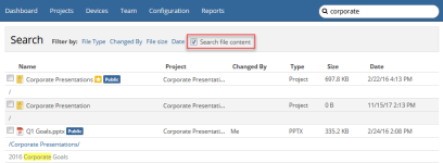 By default, your search criteria will be applied to file names only. This approach will give you faster results and fewer of them, making it easier to find what you're looking for. If you want to search file contents, just select the Search file content check box on your search results page: