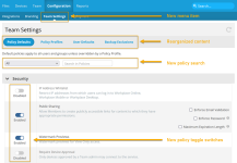 Team default policies are now easier to access, and are now called Policy Defaults. The most significant change, however, is that all available policies are listed on the page. You don't have to add or remove policies...just toggle them on and off with the new switches that have replaced our old check boxes.