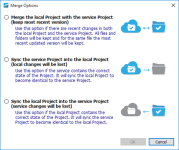 Files will be merged. If files in the same location have the same name, the most recent version will be retained. If the older version exists on Workplace Desktop, it will be deleted. If the older version exists in the service, it will be available under “Previous Versions”. - Sync the service Project into the local Project