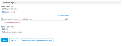 IMPORTANT If you have selected the Notify only selected admins check box and do not select any administrators in the Select team admins to notify field, no one will receive Active Directory alert messages, so it's very important to select one or more recipients.