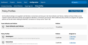 Policy profiles can then be assigned to users or groups. Using this mechanism enables assignment of policy sets on as granular level as required. These policy sets then control the security settings and feature set availability for the team.