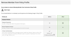 When removing a policy profile from a user or group, a summary page will also be displayed. This page displays the impact of removing that policy profile from the entity: