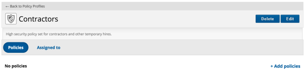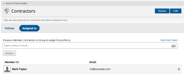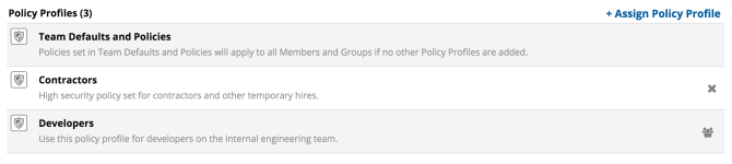 In the top section of this view, all policies applied to the entity (user or group) are displayed. Click + Assign Policy Profile to add to, or the icon to remove from, a policy profile: