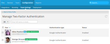 When Two-factor authentication is enabled for your team, this page allows you to disable, enable, or force 2FA for specific users in your team.