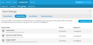 - Here, you can modify the individual policy settings, remove a policy from the profile, or click the + Add Policies link to add or edit the individual policies in the profile. You can also assign the profile to users or groups. Policies that govern backup functionality are only available to metered plan Workplace teams.