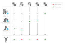 Policies applied are additive. When policies applied at the same level (for example, if a user belongs to two groups with conflicting policies) are in conflict, the more secure option will take precedence. - Policies applied to users are absolute