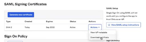 - Click Actions and download the certificate and copy the IdP metadata that you will need in order to complete this process in the Access the single sign-on configuration page in Workplace step of the Single sign-on integration guide.