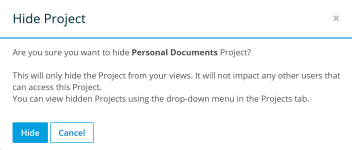 Manage > Hide | Hide the project. This will open the Hide Project popup:![]() To confirm, click Hide. Hidden projects are not deleted; they are just hidden from your views. Hiding a project only hides it for you. It will still be visible to other users. You can display hidden projects using the dropdown menu in the All Projects. |