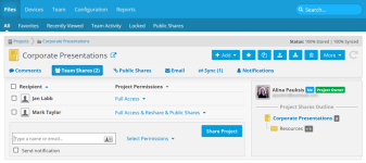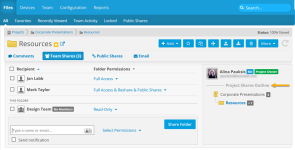 NOTE Project, folder, and file sharing is designed to support collaboration with the other members of your team. To share documents with users outside your team, please refer to Managing project, folder, and file public shares.
