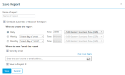 - For team, user access, or project reports, click the Manage Reports button and select Save current report. For special reports, click the Schedule Reports button and select Schedule current report. This will open the Save Report popup: