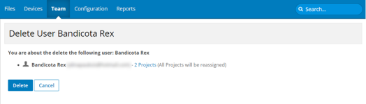 - Click the Delete button. If the user is not a project owner and has no devices associated with them, skip to step 6.