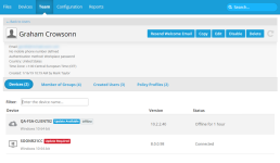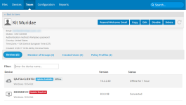 The list in the lower portion of the page displays the user's devices, the groups to which they belong, the policy profiles assigned to the user, and the other users added by the user.