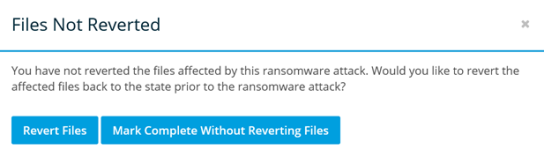 NOTE If you complete an incident without first reverting files, the following popup window will be displayed. If you select Revert Files, you may monitor the revert process, then click the Mark Incident Complete button again.