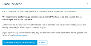 IMPORTANT This feature is designed to contain the security breach and to keep it from spreading via the sync process in the case of project files and, in the case of backup files, to provide a way to prevent backups of encrypted files and quickly revert backed up files to their last known good state. If you have a confirmed security incident, we recommend that you revert the affected files, recycle the device via Workplace, completely uninstall Workplace from the device (refer to Install or uninstall the Workplace app), scrub the device of all malware, reinstall Workplace, and restore the files from the service.