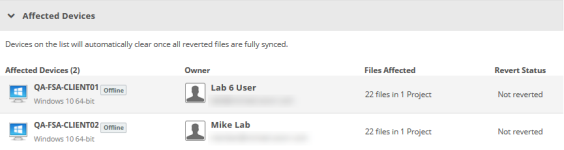 NOTE Devices on this grid will be cleared automatically when all reverted files are fully synced.