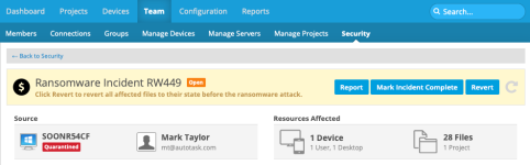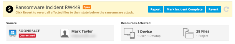 IMPORTANT The Workplace Ransomware Detection & Management feature alerts you of ransomware attacks on both your project files and your backed up files. As a result, you may see more than one incident for the same ransomware attack. We strongly recommend that you resolve ALL incidents through this interface to help ensure the security of your device and data.