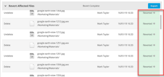 Affected files reverted | The number of files reverted, the name of the user who reverted them, and the version dates they were reverted to. |