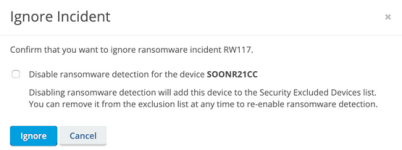 The Ransomware Incident detail page provides all the information and management tools you need to handle team security incidents detected by Workplace. Here, you can review incident details, confirm or ignore the incident, generate a report, track the incident through its lifecycle, revert affected files and export relevant information about them, review the status of affected devices, and drill to the Device Detail page for each device.