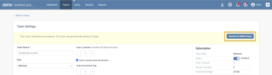 This button gives you a quick way to convert a trial team into a billed team. Just click the Convert to Billed Team button, then click the Save button IMPORTANT Once you save this change, the team cannot be converted back to a trial team. Conversion to a billed team is irreversible. |