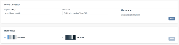 The Account Settings area allows you to change your regional settings and your time zone. Preferences allows you to select light mode or dark mode for your interface display.