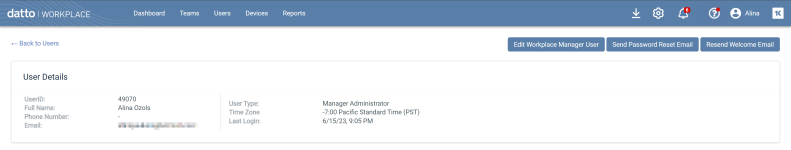On this page, Full Access users can review details about a Workplace Manager user, resend a welcome email to the user, send a password reset email, or delete the user account.