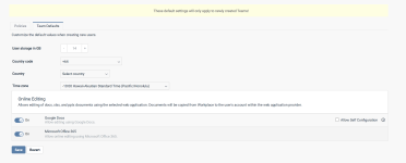 This page is comprised of two tabs: Policies and Team Defaults. The selections you make on the Policies tab will serve as the default policy profile for all new end user Workplace teams that you create.