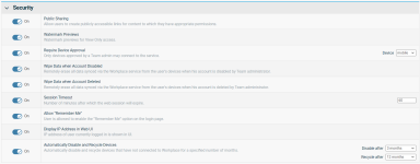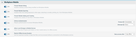 Restrict Offline Access Duration | Sets the maximum number of days that files can be accessed without a connection to the Workplace service. Requires Workplace v10.3 or higher. | Toggle the switch to On, then select a time period from the Deny access after dropdown. |