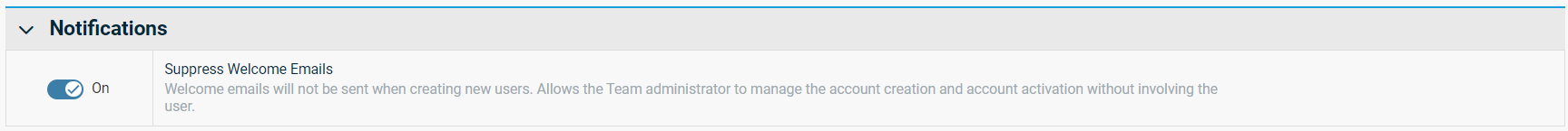 Suppress Welcome Emails to Admin | Welcome emails for new users will not be sent automatically. You may always resend welcome emails from the User details page, or from the right-click menu on the Users page. | Toggle the switch to On. |