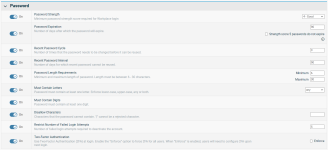 Password Strength | Minimum strength required when users create their passwords. | Toggle the switch to On, then select a minimum password strength. |