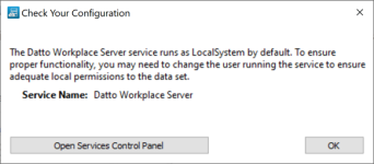 Workplace Server needs Full Access in Windows to the Workplace folder. If you use Workplace for backups, Workplace Server also needs Full Access to any items that require backup.