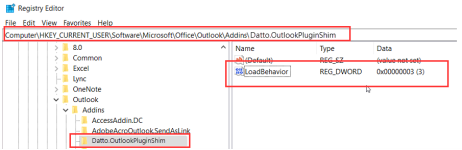 HKEY_LOCAL_MACHINE\SOFTWARE\Microsoft\Office\Outlook\Addins\Datto.OutlookPluginShim - This registry key has an entry named LoadBehavior. If the Data column value for LoadBehavior value is set to 0, the Outlook plugin will not load automatically. To ensure that the plugin loads automatically, you must set the value to 3. To do so, double click LoadBehavior, enter 3 in the Value data field of the resulting popup, and click the OK button.