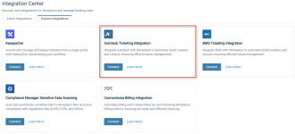 Go to the Explore Integrations tab and click Connect on the Autotask Ticketing Integration card.