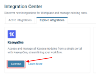 - Go to the Explore Integrations tab and click Connect on the KaseyaOne card.