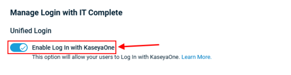 - In the Manage Login with IT Complete window that opens, turn on the Enable Log In with KaseyaOne toggle to enable the Unified Login feature, and then click Save at the bottom of the window.