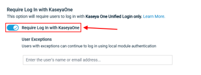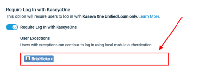 - Under User Exceptions, click into the field and type to search for the users who will be exempt from this condition — that is, they will be able to log in using either Log In with KaseyaOne or their local credentials. You can add multiple users, one at a time to this list.
