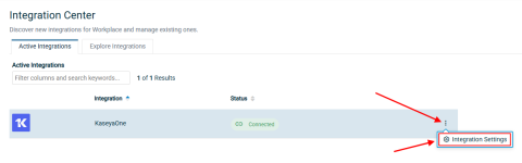- Go to the Active Integrations tab and go to Integration Settings for the KaseyaOne Integration. If the KaseyaOne integration is not in your Active Integrations tab, make sure you Link your Workplace Manager account to KaseyaOne.